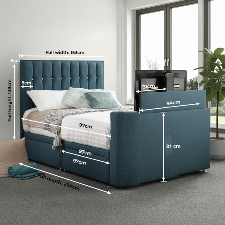 Transform your bedroom into a modern sanctuary with the Clara Sparkle TV Bed, a perfect blend of luxury design and hidden innovation. Crafted with a sleek upholstered frame, this bed features an integrated TV lift mechanism discreetly built into the footboard, allowing you to enjoy your favorite shows and movies at the touch of a button.