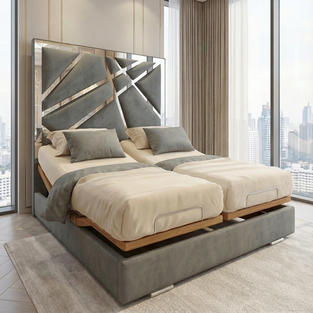 Experience luxury, comfort, and intelligent design with the Starlight Mirrored Panelled Electric Adjustable Bed. Crafted for modern living, this premium bed features an elegant mirrored panelled headboard that adds a touch of sophistication to any bedroom while enhancing light and space.