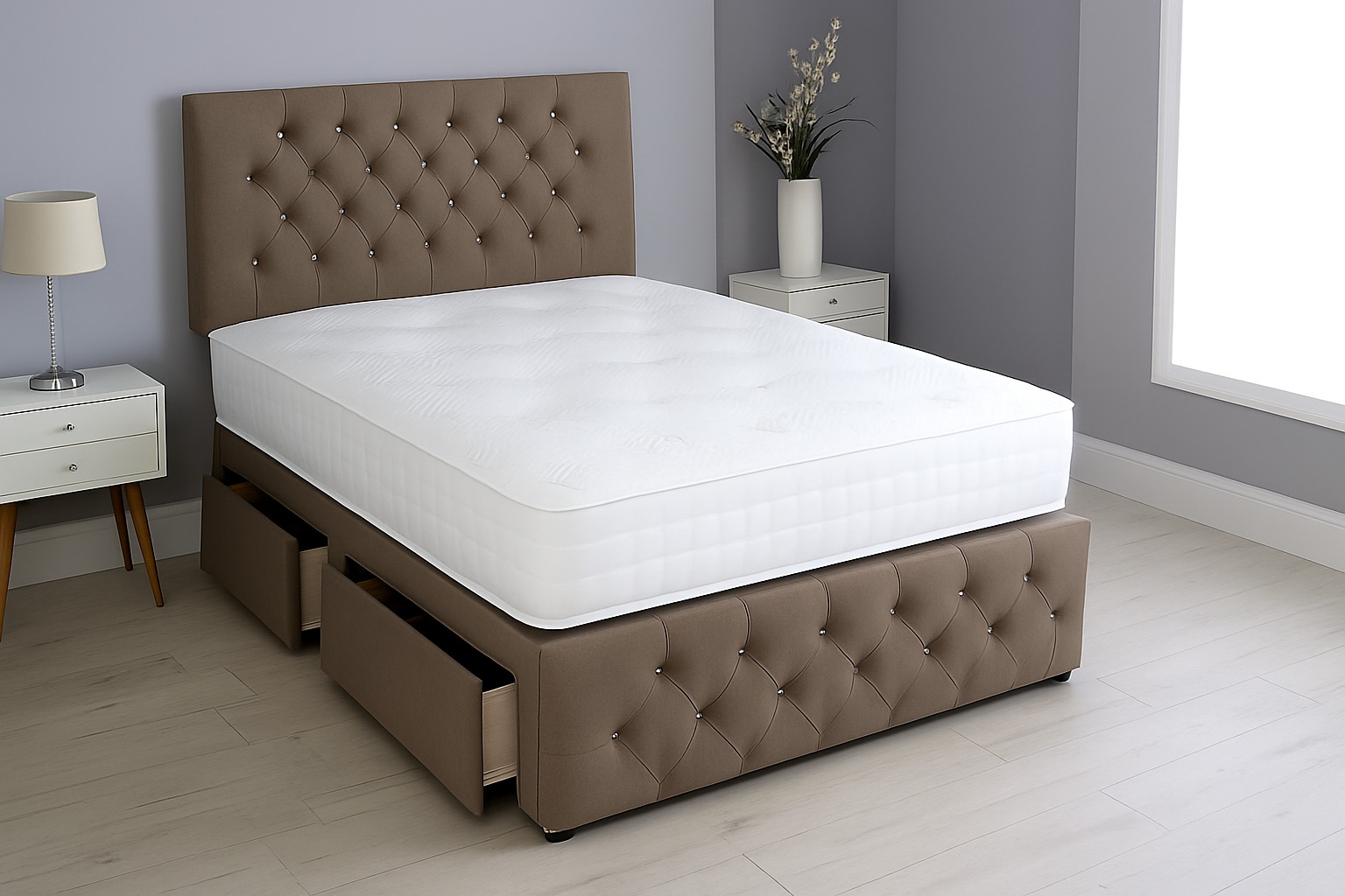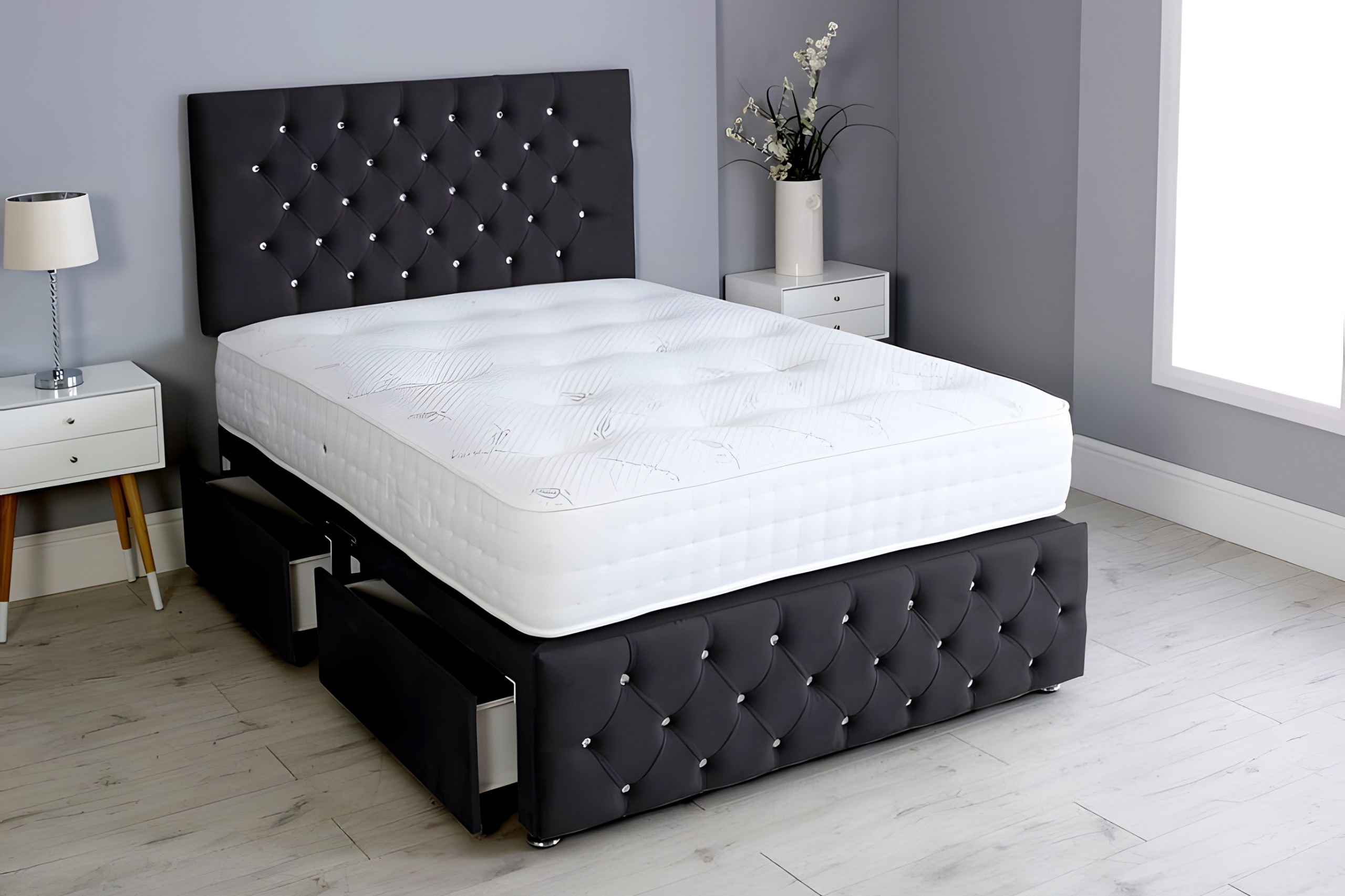 Key Features: Deep button tufting, plush velvet upholstery, two large storage drawers, durable divan base, high-profile headboard.